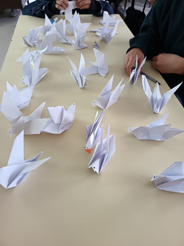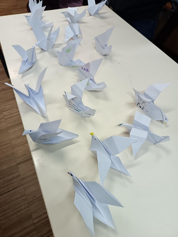 Integrado no Projeto ComunicARTE (Projeto de Desenvolvimento de competências sociais no âmbito do relacionamento interpessoal para a gestão construtiva de conflitos e comunicação não violenta), os alunos das turmas do 5.º ano, após a visualização de um vídeo alusivo a esta data tão significativa, deram asas à criatividade e à sensibilidade, construindo pombinhas em origami. Cada pombinha de papel transporta uma mensagem e tornou-se muito mais do que uma simples dobragem de papel — transformou-se num símbolo vivo do compromisso de cada um de nós com a Paz.