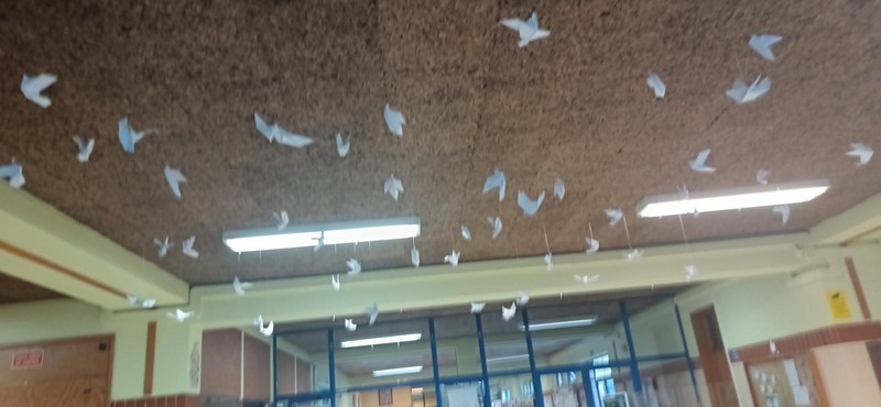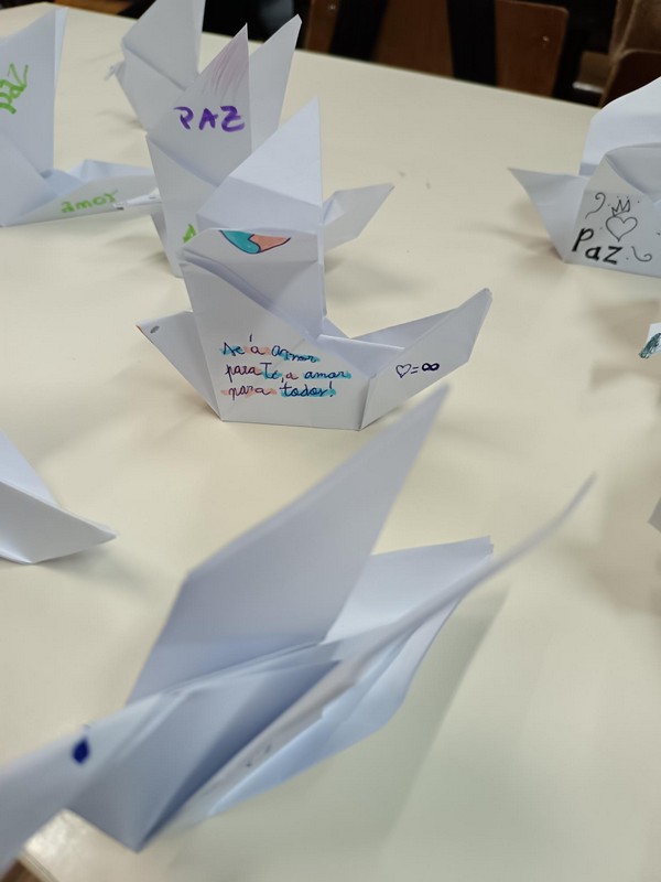 Espalhadas pelas escolas, estas pombinhas de papel representam a vontade coletiva de construir um ambiente onde o respeito pela diferença, a empatia, a tolerância, a solidariedade e o diálogo sejam princípios fundamentais das relações humanas. Pequenos gestos que, juntos, fazem uma grande diferença.