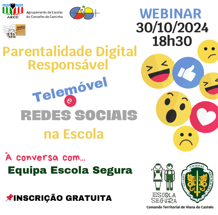 No âmbito do Projeto Educar para o Sucesso Escolar, o Gabinete de Apoio ao Aluno e à Família (GAB+) /Serviço Social do Agrupamento de Escolas do Concelho de CAMINHA, em colaboração com a Equipa da Escola Segura (GNR - Comando Local de Viana do Castelo), realizará no dia 30/10/2024, às 18h30 (Via ZOOM) mais uma À Conversa com Pais... sobre o TEMA: