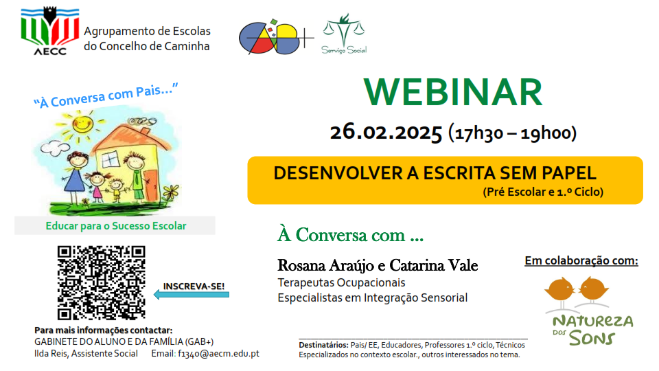 No âmbito do Projeto Educar para o Sucesso Escolar, o Gabinete de Apoio ao Aluno e à Família (GAB+) /Serviço Social do Agrupamento de Escolas do Concelho de CAMINHA, em colaboração com Natureza dos Sons - Terapia da Fala e Desenvolvimento Infantil, realizará no dia 26 de fevereiro/2025 das 17h30 às 19h00 (online - via Zoom) uma À Conversa com .. Sobre o TEMA: