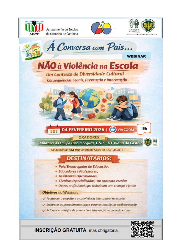 No âmbito do Projeto Educar para o Sucesso Escolar, o Gabinete de Apoio ao Aluno e à Família (GAB+) /Serviço Social do Agrupamento de Escolas do Concelho de Caminha em colaboração com a Equipa da Escola Segura, GNR – DT de Viana do Castelo, no dia 04/02/2026, às 18h00 (Via ZOOM, promove mais uma sessão do Ciclo “À Conversa com Pais…”, dedicada a uma temática de elevada relevância no atual contexto educativo e social: