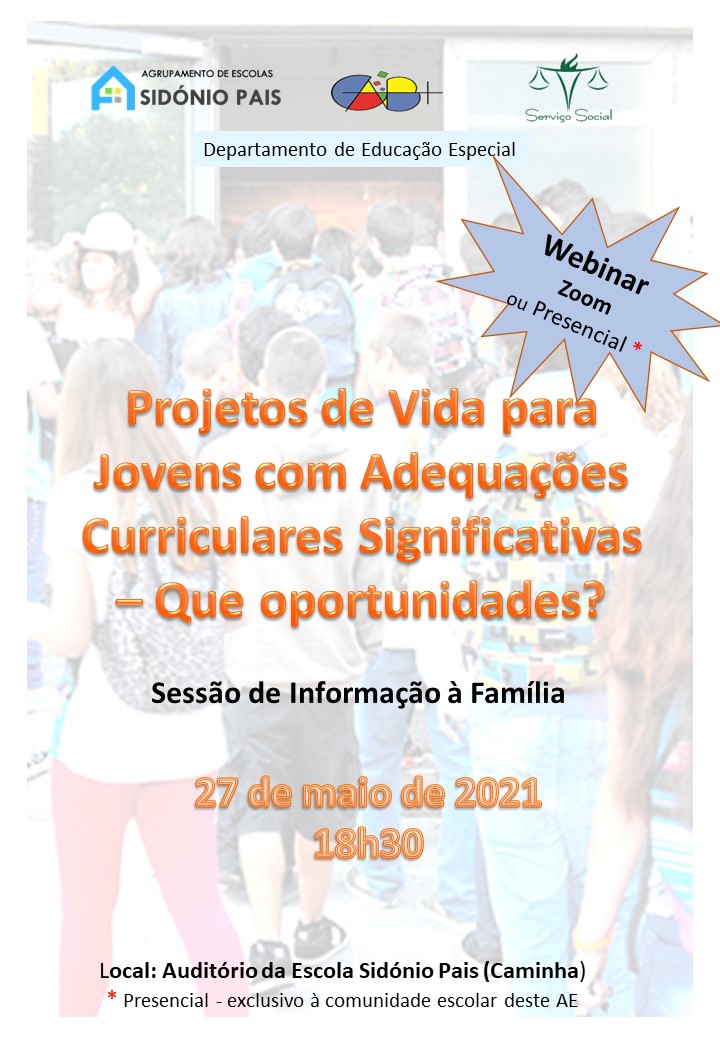 Deste modo, o Serviço Social e o Departamento de Educação do Agrupamento Sidónio Pais de Caminha realizarão no dia 27 de maio de 2021, às 18h30 uma Sessão de Informação à Família - Projetos de Vida para Jovens com ACS – Que oportunidades?”
